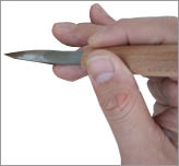 彫刻刀は刃物ですから、正しく使わないと思わぬケガをすることもあります。まずはしっかりと持つところからはじめましょう。彫刻刀の刃に近い部分を鉛筆を持つ要領で軽く握ります。人差し指と中指の間で持ち、親指を添えて支えます。