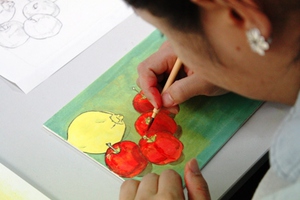 ここで紹介する「日本画」の技法はすでに溶いてあり、顔料(一部染料)を溶くのに簡単な膠液を使用するため手軽で、鉛を含む顔料を水干絵具に置き換えているため、安全に取り組めるものです。
