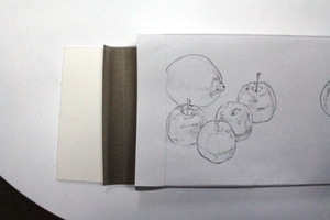 この際、大下図の鉛筆の強弱などを参考にしながら、骨描きをすると、輪郭線だけでもリンゴの立体感などを感じられたりします。