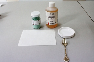 a.習作用岩絵具、透膠(すきにかわ)液、小さじ、絵皿、薄めの紙を用意します。