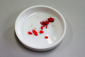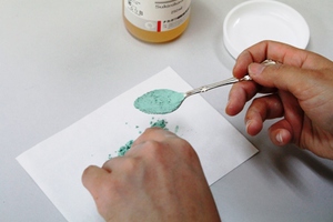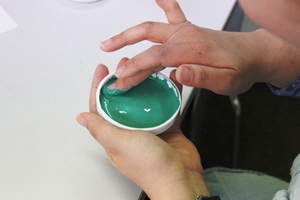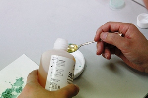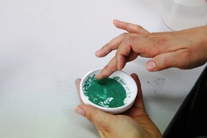 d.透膠液も同量(小さじ1)を絵皿に入れ、指の腹でよく混ぜます。