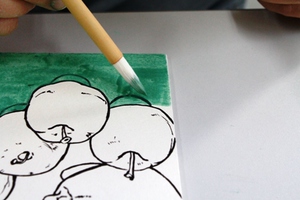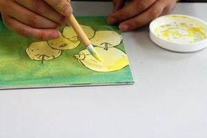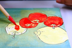 a.最初は背景から塗ります。絵具は放置すると、顔料が沈殿しやすいのでよく筆で混ぜて使用します。