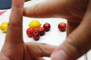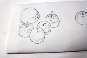 モチーフの形や光の当たり方などを、よく観察しながら、リンゴとレモンの形状を掴みます。