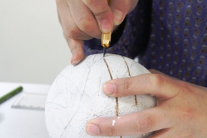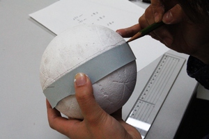 c.1周させたテープで線を引いて「赤道」の印をつけます。赤道はちょうど球を2等分するので、スケッチの裏面→表面の目印にできます。