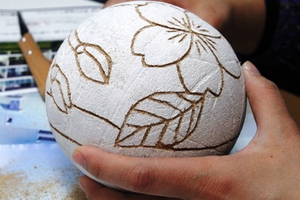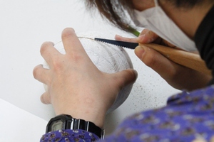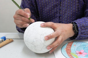 写真のような鞠(球体)のデザインをしながら、自分だけのオリジナルの鞠が作れます。難しい技法のように感じますが、コツを掴むととても楽しく仕上がりも美しい技法です。文化祭や展覧会、卒業に向けて記念に制作してみてはいかがでしょうか?