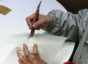 細かい部分は、最初にアートナイフなどを使用して、線の輪郭に切り込みを入れて