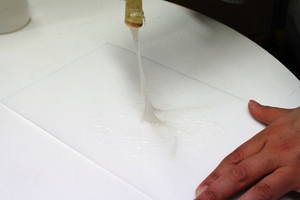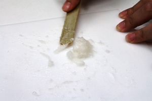 写真の状態は、耳たぶより少し固いくらいです。これは、修正用に使用するくらいの固さです。糊に使用する場合は、もっとゆるく、「洗濯のり」くらいのゆるさにします。