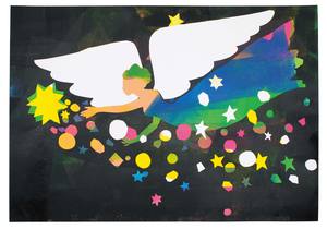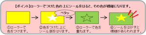 シール版を貼った後にローラーで色をつける工程を何回か繰り返し、最後にシール版を全てはがすと模様が幻想的に浮かび上がってとてもキレイです♪シールを何回かに分けて貼ることがコツです。浮かび上がる模様を工夫して、作ってみましょう!