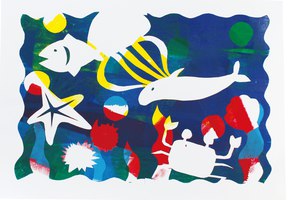 この場合、仕上がりのときにシールをはがすと、イルカと魚 は白色 になります。一回目に貼るシール版は、白く抜きたいものを貼りつけましょう。