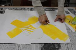 ローラー遊びから誕生した、はってはがせるシールを使って簡単にできる版画です。