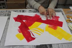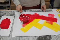 ローラーで色をつけたところに版をうまくのせて、模様に色をつけてみてくださいね。