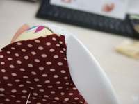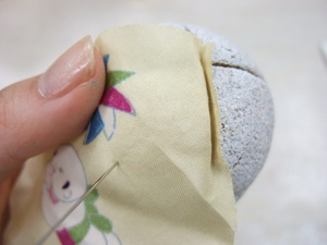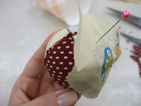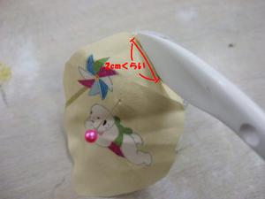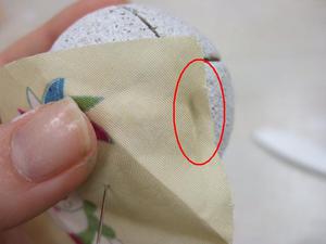 1辺を木目込んだら、向かいの1辺を木目込みます。布にシワがよらないよう、布を張りながら木目込むと仕上がりがキレイになります。はみ出てしまった布は、先の細いはさみでチョンチョンと切っておきます。