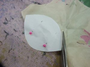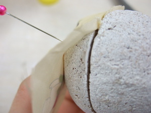 カットした布をボディにまち針で固定したら、溝に沿って2cmほどへらで軽く押し込みます。