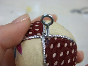 できあがったミニ鞠はそのまま飾っても素敵ですが、今回はセットに付属しているキーホルダー金具を使って、木目込みキーホルダーをつくります。まず、十字から少し外れた場所にヒートンを取り付けます。きりで小さい穴を開けてからヒートンを刺すと取り付けやすいです。