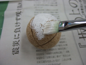 ボディは桐の粉で作られており、写真のように木の色をしています。このまま布を木目込んでいくと、木の色が透けて見えてしまい、見栄えがあまり良くありません。仕上がりがキレイになるように、ボディを白く塗っていきます。