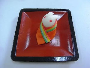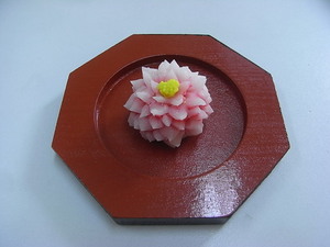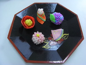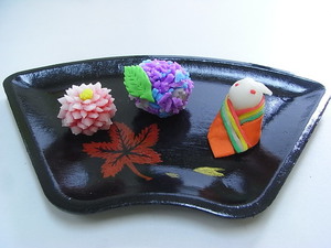 デパ地下の和菓子屋さんのディスプレイからヒントをもらって…。漆塗りのお皿にのせると、いかにも和菓子な感じが出ますよね。