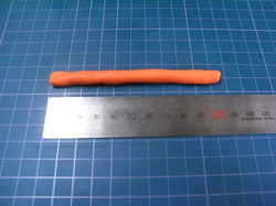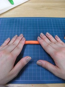 色を練り込んだら、ねんど板の上で粘土をころころと転がして、約10cmのひもをつくります。