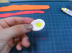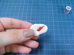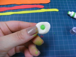 つまようじなどの先のとがったもので目のくぼみをつくり、赤い色の粘土を小さくしてはめこみます。