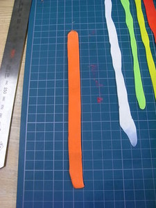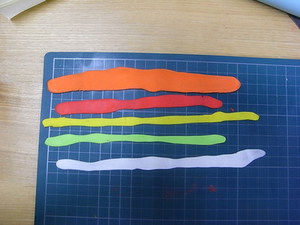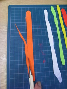 作品の見栄えを良くするために、カッターナイフで端を切り取って、まっすぐに整えます。他の4色も同様です。