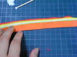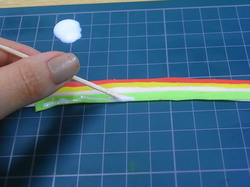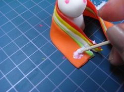 襟のパーツを重ねていきます。それぞれの色が2~3mmずつ見えるように重ねます。粘土が乾燥し始めて、粘土どうしがくっつきにくい場合は、耐水性ボンドを使用します。