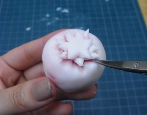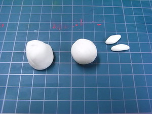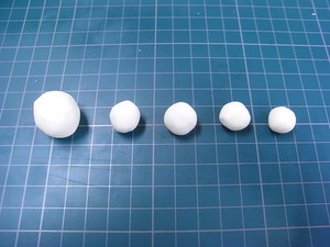一番面積の大きい衣をつくる用に約2cmの球を1個、襟用に約1cmの球を4個つくります。