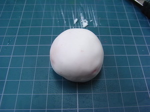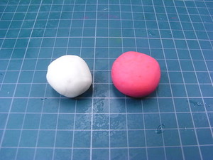 絵の具を練り込んで、球を2つつくります。外側の、皮にしたいほうの色(今回は白です)を、およそ2cmの球にします。中身を(今回は赤です)、およそ3cmくらいの球にします。