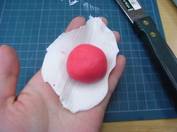 小さい方の球(白)を、のし棒で厚み1mmくらいに薄くのばします。大きい方の球(赤)を、薄くのばした皮で包みます。