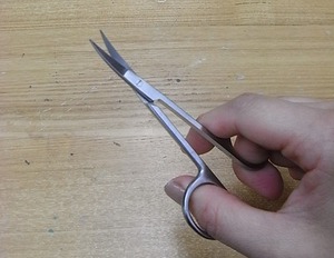 はさみが3mm~4mmくらい沈んだら、ちょきんとはさみを閉じます。閉じたら、はさみを少しだけ上げながら抜きます。