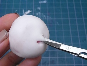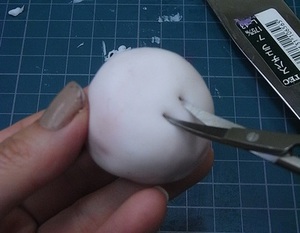 はさみを5mmくらいひらき、大福の頭に、上から押し付けるようにして入れます。