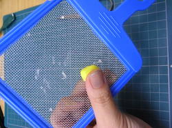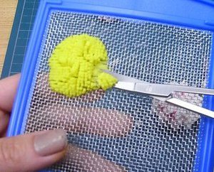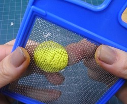 めしべの、ふさふさしたパーツをつくるためにスパッタリング用の金網を使います。網目が細かいので、よりふさふさした表現ができます。黄色い粘土を、ぐぐぐっと押し出します。