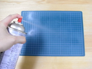 今回、粘土板としてカッターマットを代用しています。樹脂粘土は非常にくっつきやすいです。板からはがしやすくするために、潤滑剤としてシリコンスプレーを吹きつけます。一か所に集中しないよう、まんべんなくスプレーします。