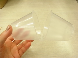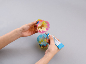 プリンカップの口と口をあわせて、化学接着剤でくっつけます。