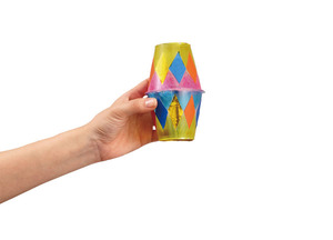 大振りすると、カップが完全に開いてしまい音が鳴らないので注意してくださいね。写真の作品は、両面カラーデザインペーパーと色紙セットで飾りつけした「かえるカスタネット」です。