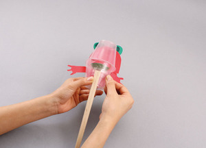 (1)でセロテープを留めた下あたりに、割りばしの細い方を上にしてセロテープで留めます。カップの角度に沿わせて、ぴったり固定しましょう。これが持ち手になります。
