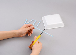 カッターナイフで、スチロールトレーを約3cm幅に切ります。