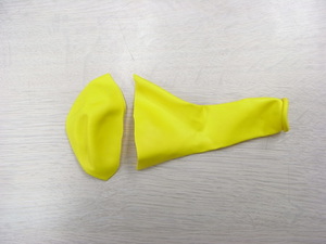 風船を、一番膨らんでいるところで2つに切ります。左の、丸い部分だけ使います。