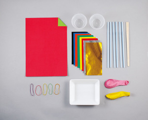 わりばし 1膳、ストロー 約220×直径5mm 6本、風船 2個、両面カラーデザインペーパー(赤/緑)190×270mm 1枚、色紙8色セット(赤・青・黄・緑・橙・黒・金・銀)75×150mm 1組