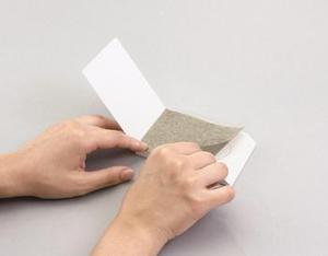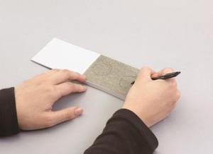 パラパラまんがの一番上の紙(95×65mm)にあわせてカットしたグレーのグラフトペーパーを、光沢のない方を下にしてぴったり重ねます。その後、グラフトペーパーの上から、1枚目を鉛筆で自由に描いていきます。