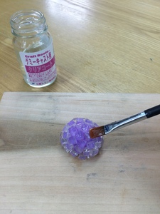 乾くと透明になるタイプの接着剤で、先につくっておいた芯材に貼りつけていきます。ピンセットで一粒一粒つまみながら貼りつけていくとよいでしょう。