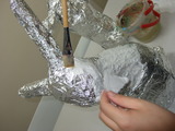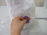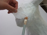 雲龍紙を4~5cm大にちぎったり、はさみで切ったものを、離型液で芯材に貼り付けていきます。全体に丁寧に貼り付けましょう。くちばしや耳などの盛上げる部分は、胴体との境目に大きい紙を貼ると浮いたりヨレたりしてキレイに貼れません。小さくちぎった紙を貼って、キレイに仕上げましょう。
