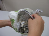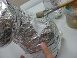 アルミホイルを上からかぶせて、覆っていきます。ずれたり浮いたりしてうまくかぶせられない場合は、上の写真のようにセロテープを輪にしたものをアルミホイルの裏に貼り、芯材にくっつけます。