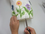 色雲龍紙を貼り終えたら、3層目の雲龍紙を貼りつけていきます。色雲龍紙の上から貼ることで、光源を入れたときにぽわっとやさしく模様が浮かび上がります。はっきりと模様を際立たせたい場合は、3層目の雲龍紙を貼りつけた後に、色雲龍紙を貼りつけてください。