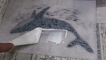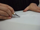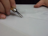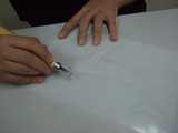 ポリシートは乳白色ですが、透過性がありますので、下絵をシートの上に置けば絵柄が透けて見えます。彫る時に版の下に下絵を置き、テープで固定すれば下絵に沿って彫り進めることができます。ニードルを使って丁寧に下絵をシートに写しましょう。