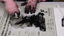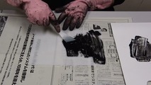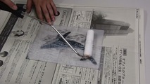 メディウムが乾かないうちに手早く刷り紙をのせます。手のひらで空気を押し出すようにしてそっと刷り紙と版を接着させます。