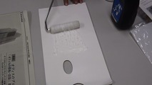 ≪ ワンポイント ≫ローラー塗布の際、はみ出したメディウムは、紙をのせる前に拭き取っておいて下さい。またメデイウムは乾燥しやすいので、刷り紙をのせる前に乾いてしまわないよう手早く作業を行ってください。