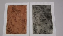 ≪ ワンポイント ≫乾き具合を確かめるには手で刷り紙に触れて、湿り気がないかを確認します。また、光をあてて刷り紙の面から版を透かして見ます。乾いていれば版がきれいに透けて見え、白っぽくぼんやりと見えるようなら乾燥が不十分です。